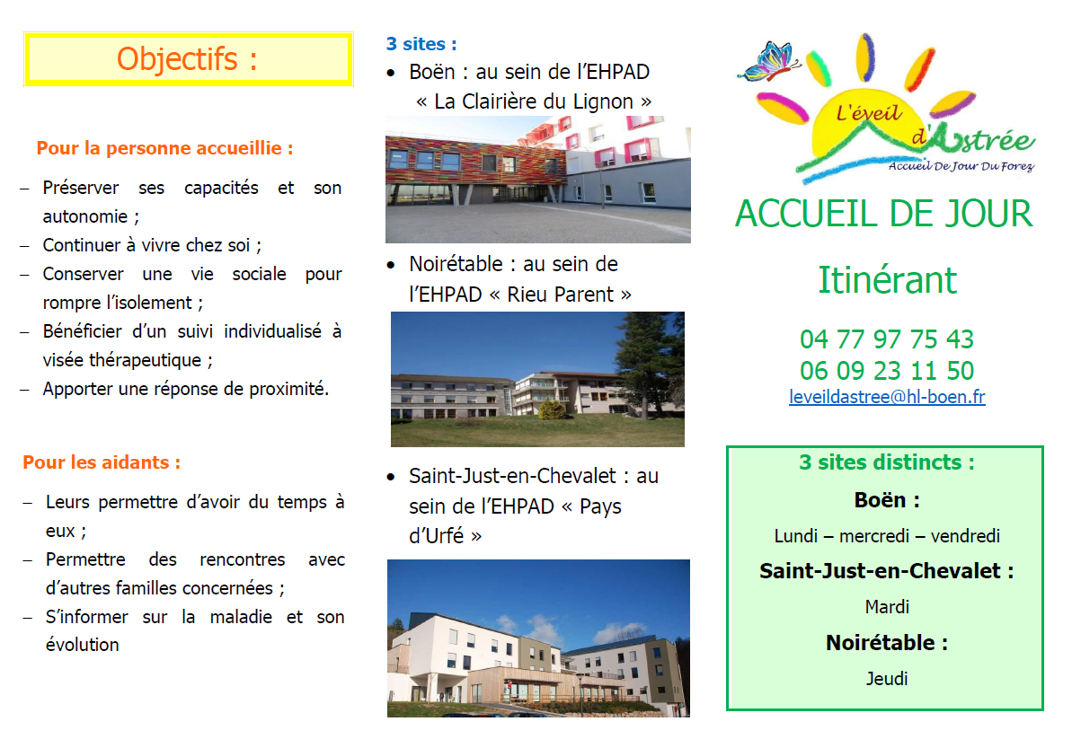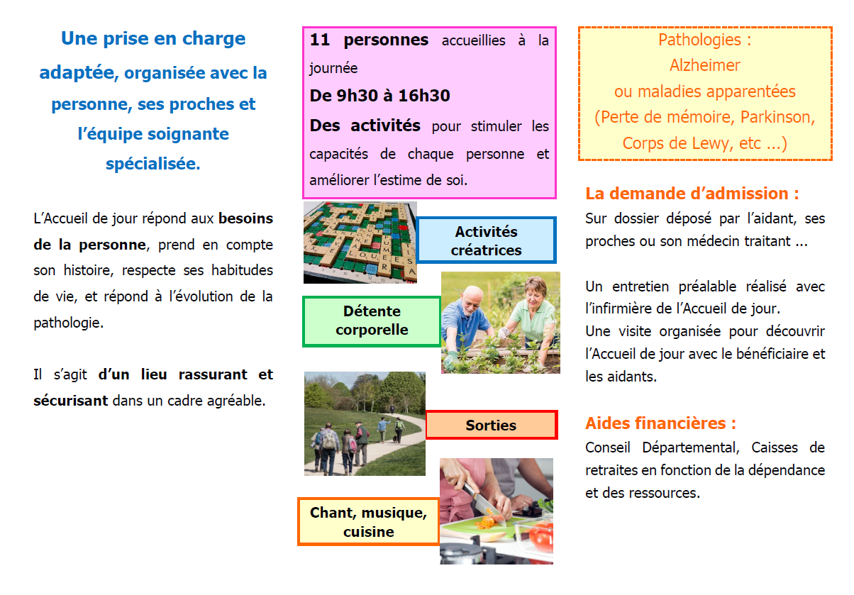![]() ![]() | Un accueil de jour pour les malades d’Alzheimer ou pathologies apparentées est proposé aux habitants de la CCPU. L’accueil se fait tous les mardis au sein de l'EHPAD de Saint Just en Chevalet. Ce service est un accueil itinérant, issu du Centre Hospitalier de Boën.
